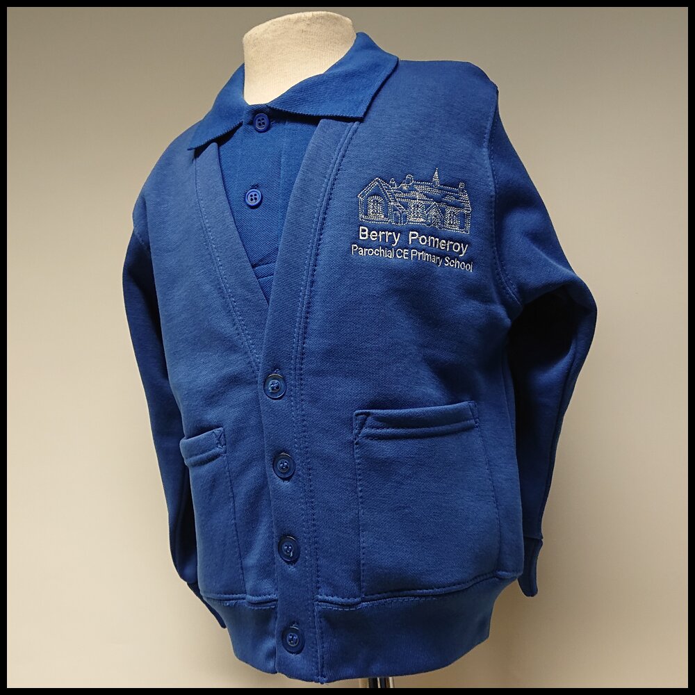 Royal blue button front junior cardigan embroidered with the Berry Pomeroy CE Primary School badge 65% Polyester 35%.