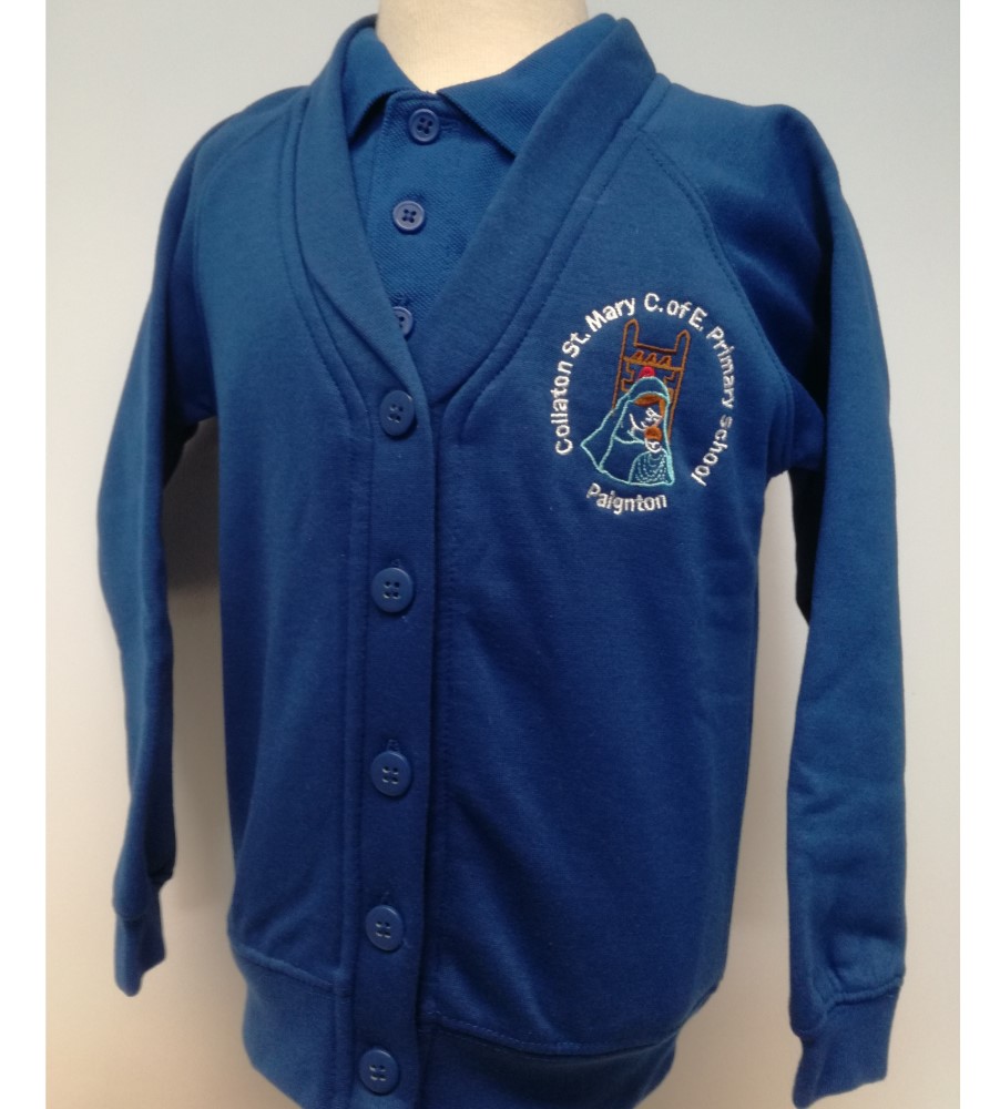 Royal blue button front junior cardigan embroidered with the Collaton St Mary C of E Primary School badge.