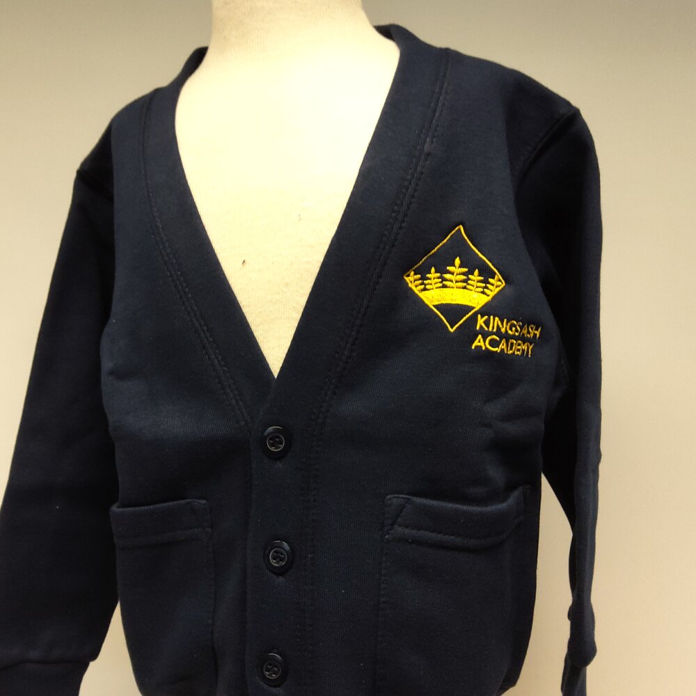 Navy blue button front cardigan embroidered with the Kings Ash Academy badge.