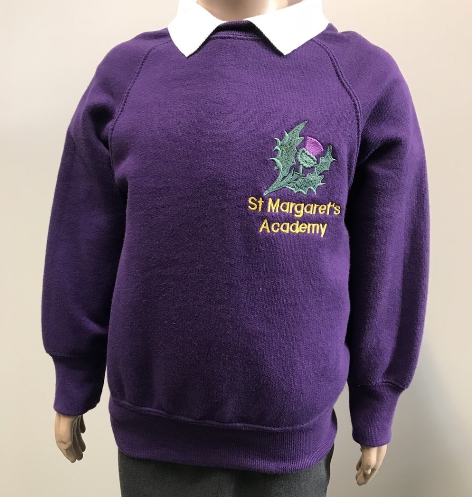 Purple crew neck sweatshirt, embroidered with the St Margarets Academy badge.