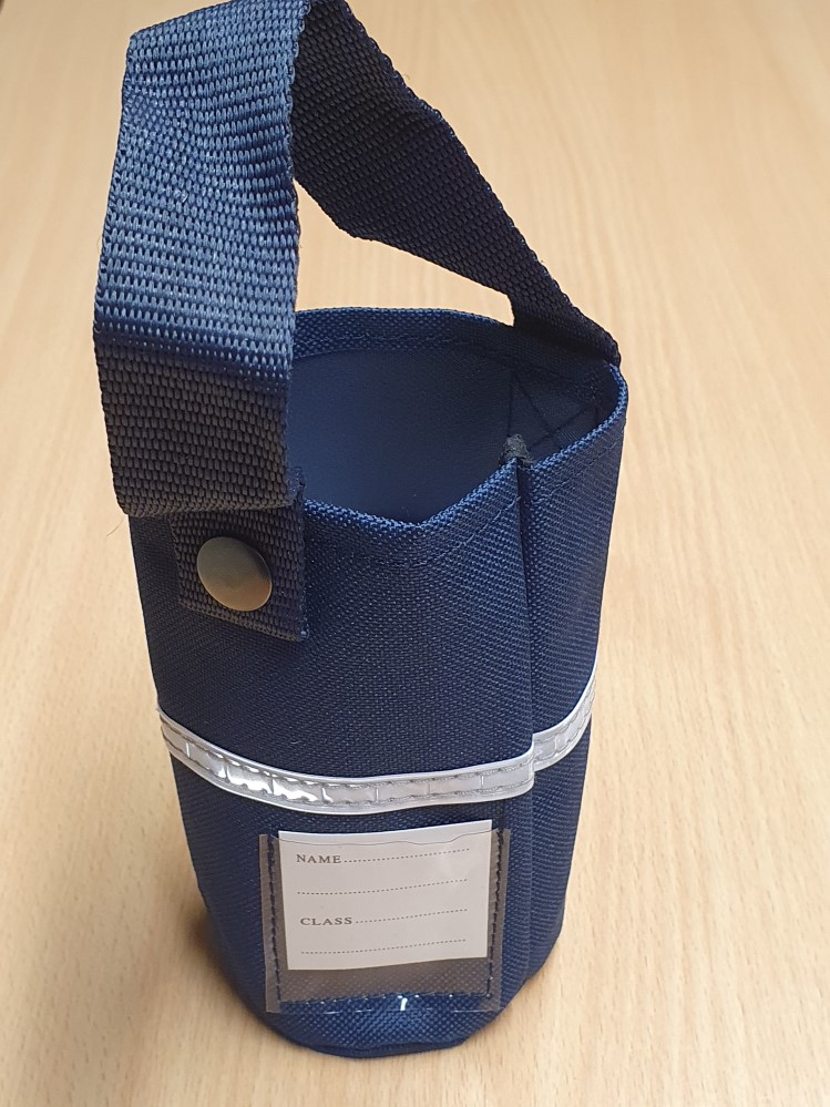 The ideal accessory to carry a water bottle to school. Fits on any bag. Name card, reflective strip and drainage hole.  Fits 500ml plastic water bottle.